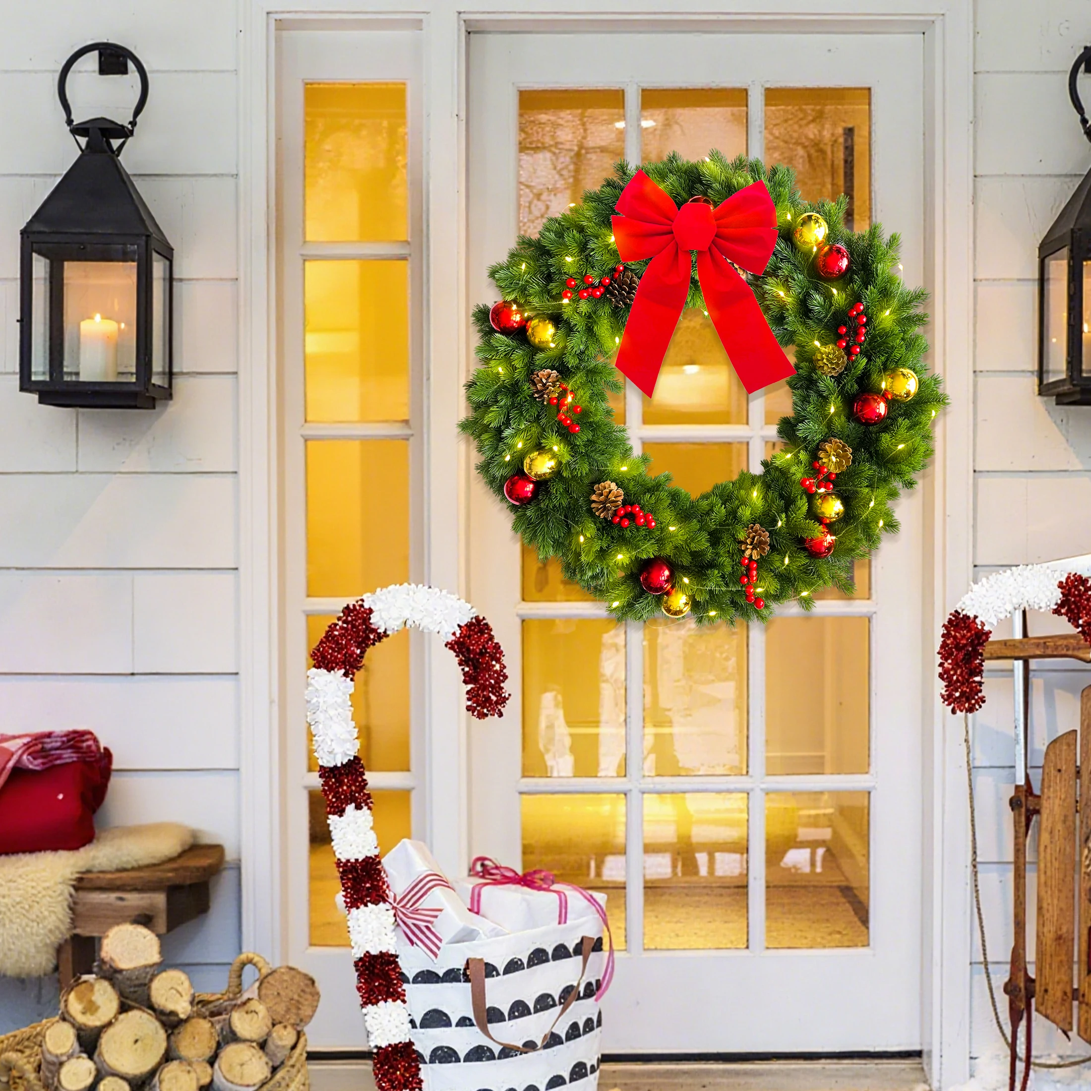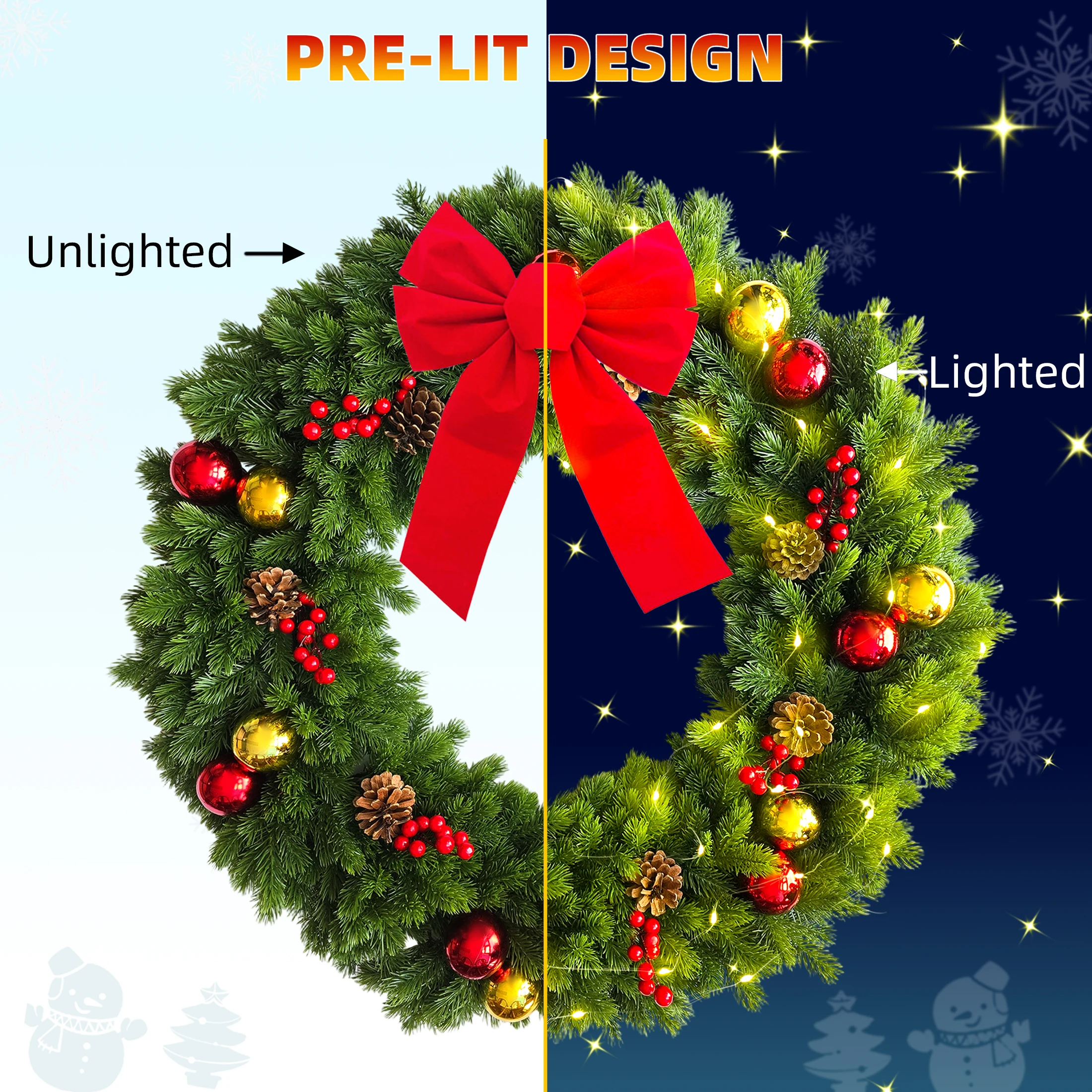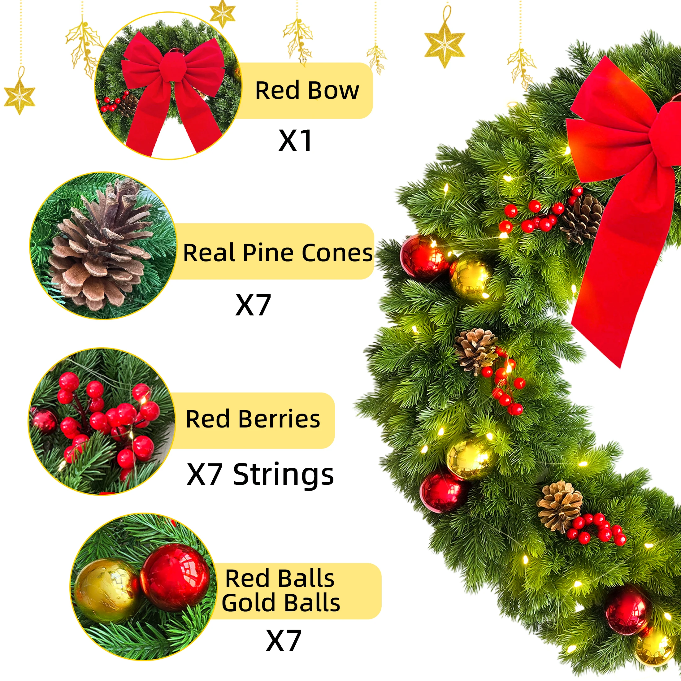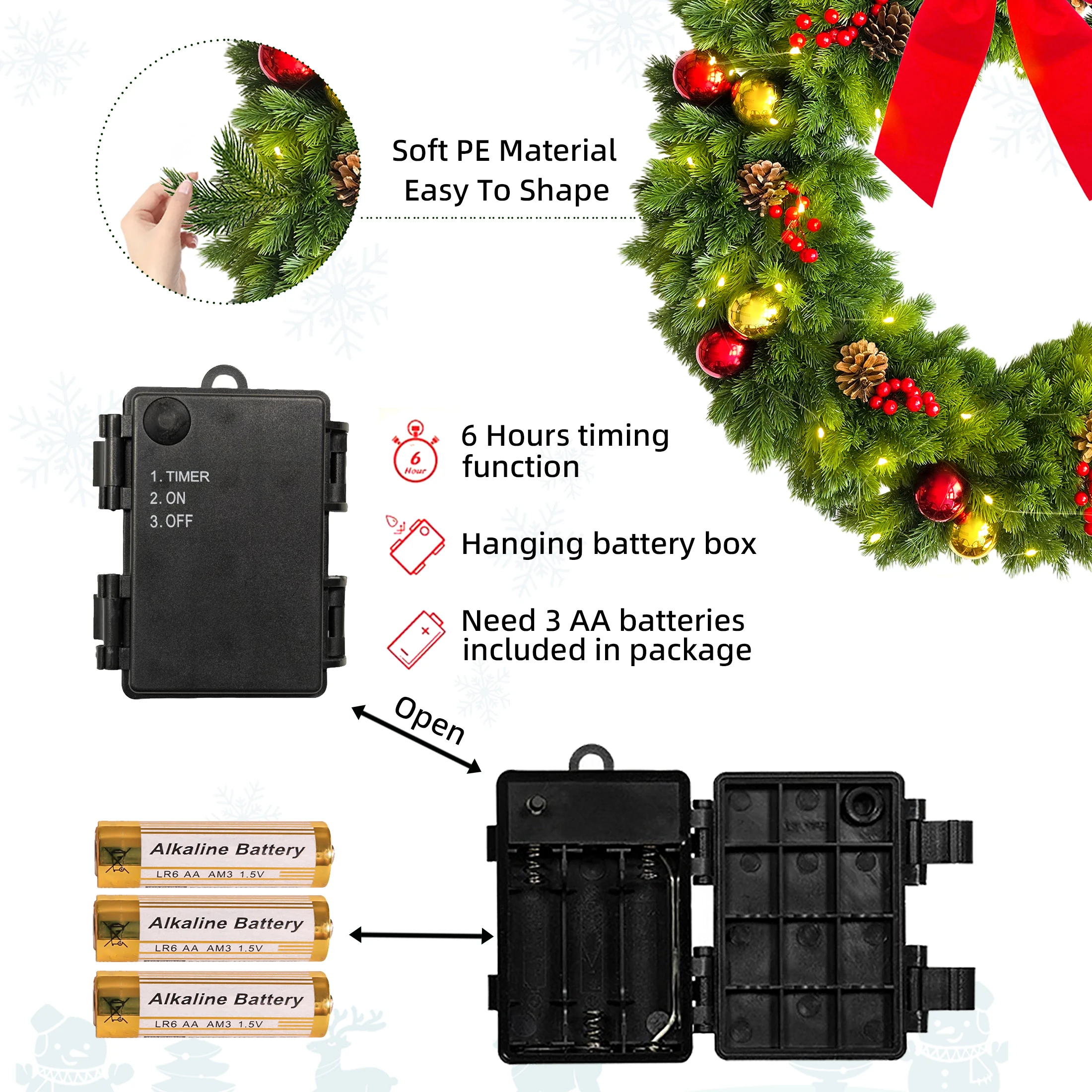 2.62FT Artificial Christmas Wreath Garland, LED Lights, Bow, 3 AA, Door, Fireplace, Stair, Party, Wall, Home Decor, Xmas Decor