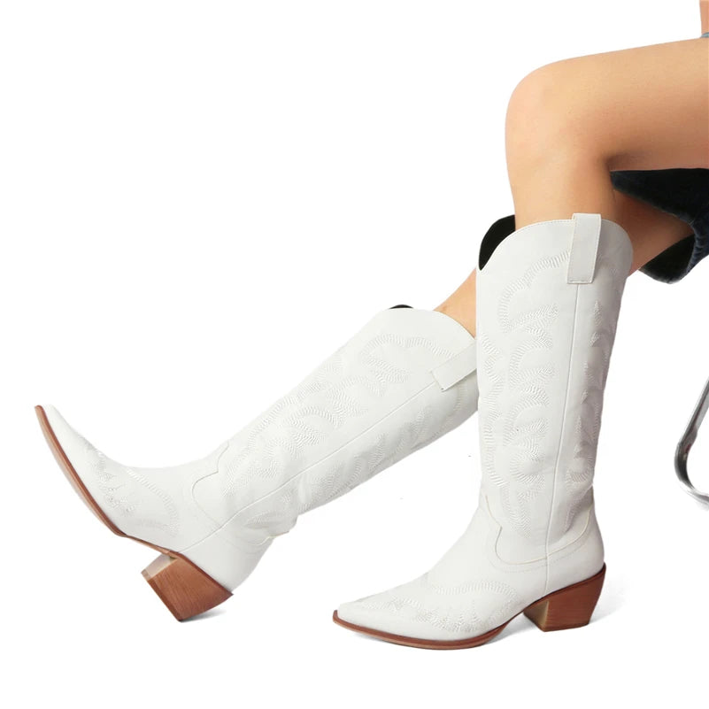 Meotina Women Knee High Cowboy Boots Pointed Toe Thick High Heels Embroidery Western Cowgirl Long Boots Ladies Fashion Shoes 43