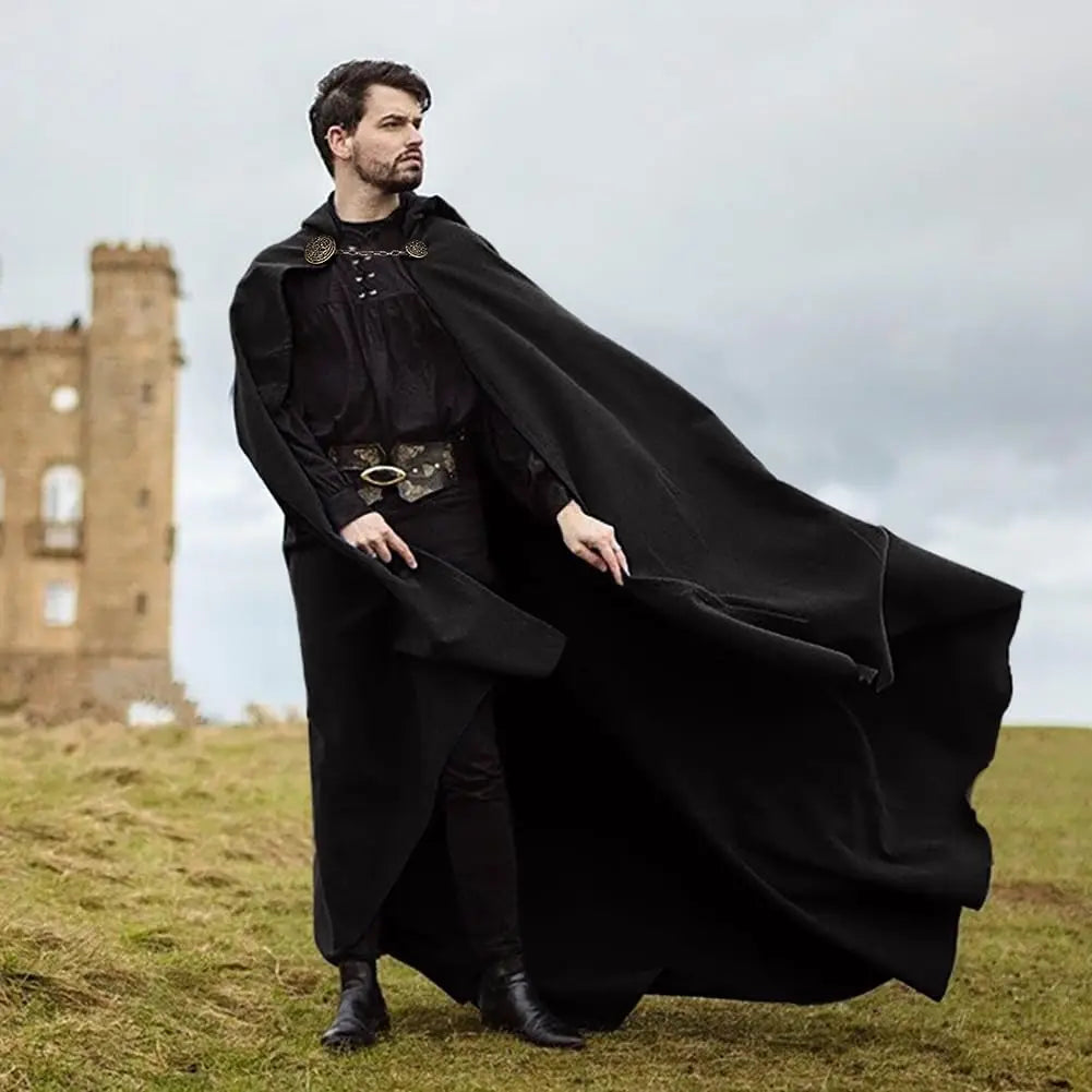 Viking Hooded Cape – Medieval Black Renaissance Cloak with Hood, Chain Clasp for Halloween, Cosplay & Costume Events