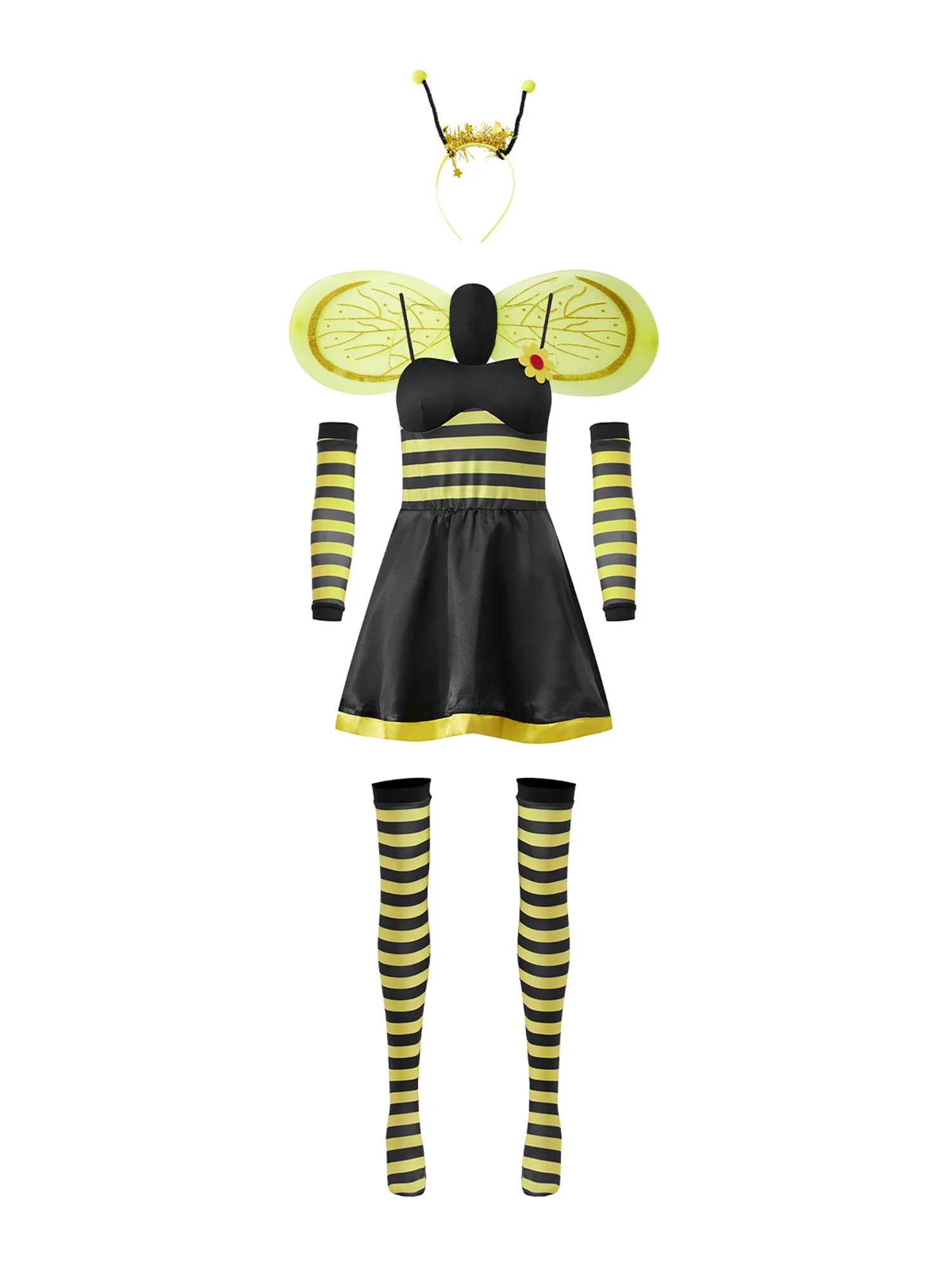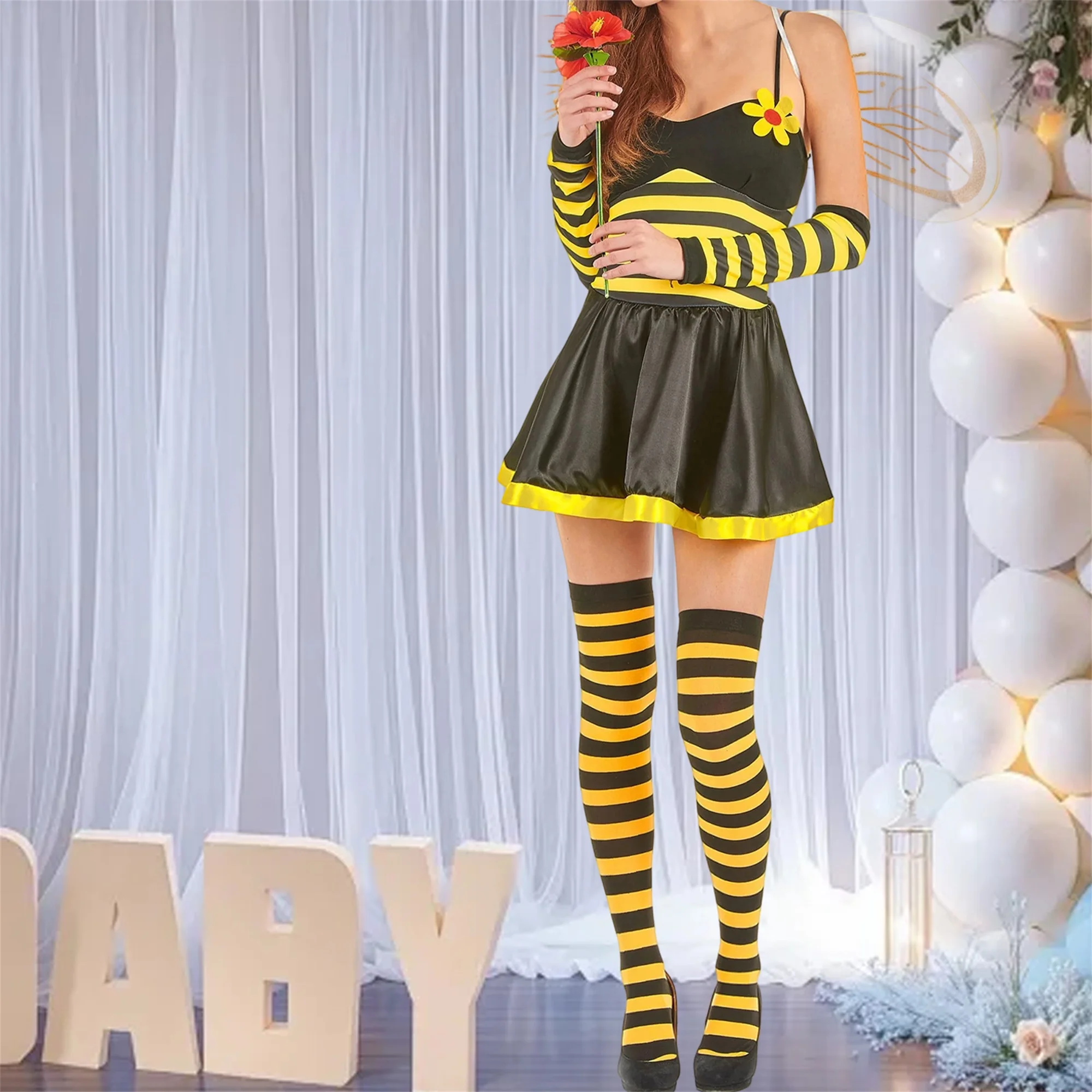 Women Halloween Bee Cosplay Costume Cami Dress Headband Wing Arm Sleeves Stockings Set for Themed Party